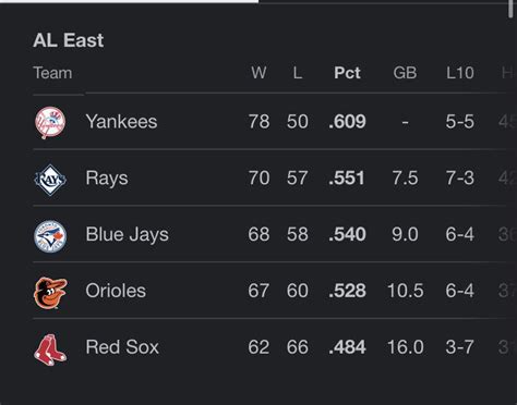 As of today, here’s a snapshot of how the teams stack up in the AL East. Remember, things can change quickly in baseball, so this is just a moment in time. Keep checking back for the most up-to-date information!