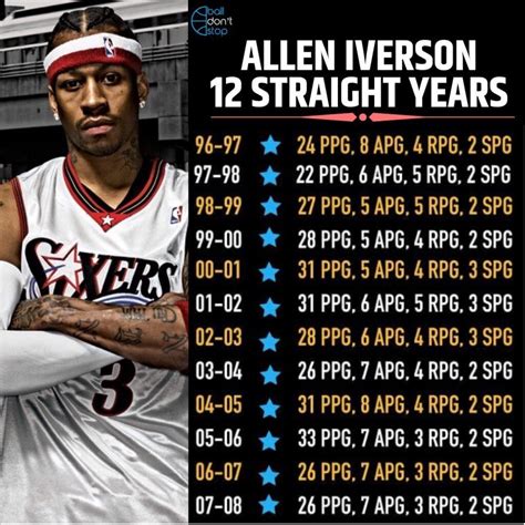 When we place Allen Iverson’s 2004 stats in the context of his career, we can better understand their significance. While Iverson consistently put up impressive numbers throughout his career, the 2004 season stands out for several reasons. Compared to other seasons, this was a year where he shouldered a particularly heavy offensive load, with his scoring output reflecting his importance to the team. The consistency he showed throughout the season, game after game, was remarkable. He was the primary scoring option, and he delivered night after night. His ability to maintain a high level of performance despite facing constant defensive pressure is a testament to his skill and determination. When comparing his 2004 stats to his other seasons, it is evident that this year was among his best. His scoring average was consistently high, and his overall impact on the game was significant. This season was a peak performance. The 2004 season was one of the most remarkable of his career, highlighting his consistency and his scoring prowess. The circumstances surrounding the 2004 season make his performance even more impressive. The 76ers weren’t always a team with a deep roster, which meant that Iverson had to carry a greater burden. His willingness to take on this challenge and his ability to thrive under pressure set him apart. His commitment to excellence and his unwavering determination made him one of the most exciting players in the league. It’s clear that the 2004 season wasn’t just a collection of numbers. It was a testament to his talent, his hard work, and his unwavering commitment to his team. Comparing this season with others underscores his value and his ability to consistently deliver outstanding performances. It’s a reminder of why Iverson is considered one of the all-time greats. His impact was significant, and the statistics from 2004 are a key part of his legacy. Comparing these stats to other seasons highlights the value and consistently high level of play Iverson showcased during this period.