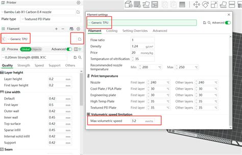 • Filament Profile : Start by selecting the correct filament profile in Bambu Studio. If a profile for your specific TPU isn’t available, start with a generic TPU profile and then adjust it as needed.