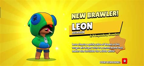 Next up, we have Leon , the elusive, stealth-master Brawler. Leon is a close-range assassin known for his invisibility and ability to ambush opponents. His main attack, Slice and Dice , fires a volley of four blades that spread out over a short distance, dealing moderate damage. His super, Smoke Bomb , makes him invisible for a few seconds, allowing him to sneak up on enemies, escape from dangerous situations, or reposition himself for an attack.