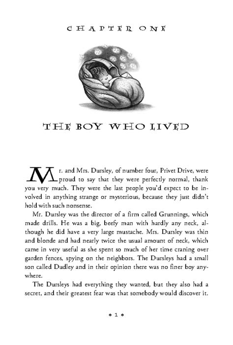 The Dursleys live at number four, Privet Drive, and they are proud to say that they are perfectly normal, thank you very much. They are the last people you’d expect to be involved in anything strange or mysterious, because they just don’t hold with such nonsense. Mr. Dursley is the director of a firm called Grunnings, which makes drills. He is a big, beefy man with hardly any neck, although he does have a very large mustache. Mrs. Dursley is thin and blonde and has nearly twice the usual amount of neck, which comes in very useful as she spends so much time craning over garden fences, spying on the neighbors. The Dursleys have a small son called Dudley and in their opinion there is no finer boy anywhere. The Dursleys have everything they want, but they also have a secret, and their greatest fear is that somebody will discover it. They don’t think they could bear it if anyone found out about the Potters. Mrs. Dursley was a Potter, but she hasn’t seen her sister in years. In fact, she pretended that she didn’t have a sister, because her sister and her good-for-nothing husband were as unDursleyish as it was possible to be. The Dursleys shudder to think what the neighbors would say if the Potters arrived in the street. The Dursleys knew that the Potters had a small son, but they had never even seen him. This boy was another good reason for keeping the Potters away; they didn’t want Dudley mixing with a child like that.