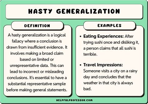 Hasty generalizations aren’t just harmless errors in reasoning; they can have significant real-world consequences. They can perpetuate stereotypes and prejudices. When we make broad, sweeping statements about entire groups of people based on limited interactions, we reinforce harmful stereotypes that can lead to discrimination and unfair treatment. Imagine believing that “all teenagers are irresponsible” based on a few negative encounters. This belief could influence how you interact with teenagers, potentially leading to biased judgments and missed opportunities. They can distort public opinion and policy. Hasty generalizations can shape public perception of important issues, leading to misguided policies and ineffective solutions. If policymakers rely on anecdotal evidence rather than comprehensive data, they may address the wrong problems or implement policies that have unintended consequences. They can fuel social divisions. When we overgeneralize about different groups, we create an “us vs. them” mentality that can exacerbate social divisions and hinder constructive dialogue. Believing that “all members of political party X are evil” makes it difficult to find common ground or work together to solve shared problems. They can damage reputations and careers. A hasty generalization can ruin someone’s reputation or career based on a single mistake or misjudgment. Imagine someone being labeled as “incompetent” based on one failed project. This label could follow them for years, limiting their opportunities and undermining their confidence. They can erode trust in institutions. When news outlets and other institutions rely on hasty generalizations, they lose credibility and erode public trust. People become skeptical of the information they receive and less likely to engage in civic life. To mitigate the impact of hasty generalizations, it’s crucial to promote critical thinking skills, encourage balanced reporting, and foster open dialogue. By challenging our own biases and demanding more rigorous evidence, we can create a more informed and equitable society.