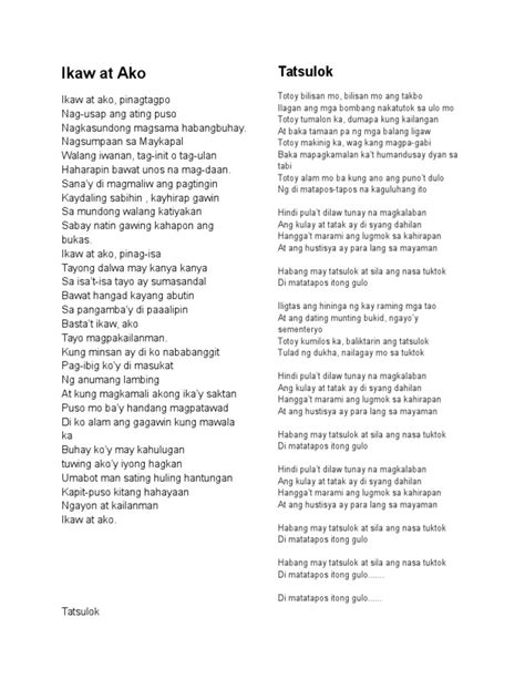 Let’s get straight to the core of it, guys. Here are the original Indonesian lyrics for “Ikaw At Ako” . Pay close attention to the flow and the sounds – even if you don’t understand Indonesian, you can often feel the emotion. We’ll present them verse by verse, so it’s easy to follow along. This is the raw, unadulterated text that has captured so many hearts. It’s important to see these lyrics in their original form to appreciate the nuances that sometimes get lost in translation. Indonesian has a beautiful way of expressing deep emotions with a certain elegance. The phrasing, the word choices, they all contribute to the overall feeling of the song. As you read through these lines, try to imagine the story unfolding. Think about the situations the singer might be in, the feelings they are trying to convey. The repetition of certain phrases, the build-up in the chorus – it’s all designed to create a powerful emotional impact. For many, this part is where the magic truly begins. It’s like holding the key to a secret message, and soon enough, we’ll be unlocking that message with the translation. Remember, the goal is to understand “Ikaw At Ako” lyrics in their original context before we move on to how they translate into English. This initial immersion is crucial for appreciating the subsequent explanation and translation. We want to make sure that when we talk about the “Ikaw At Ako” lyric and translation , you have the full picture, starting from the source.