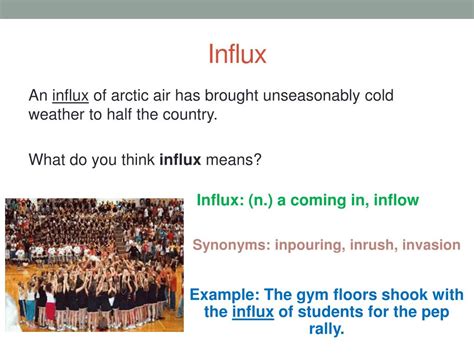 • Arrival : This is another general synonym. The emphasis is on the moment something gets there. It’s a bit more general, but it covers the core meaning of “influx”. Think about “the arrival of spring,” which signals change and a new season.