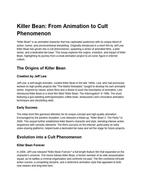 Let’s talk about the origin story of Killer Bean , guys. It’s not just a movie; it’s a passion project that started way back in the late 90s. Jeff Lew, the mastermind behind Killer Bean, began this journey as a short film project in 1996. Think about that – 1996 ! He was an animator, and he had this incredible idea for a coffee-loving, bean-shaped assassin. He poured his heart and soul into it, often working solo in his garage, honing his skills in CGI animation. The original short film was a hit, showcasing the potential for Killer Bean and his world. The success of the short paved the way for the feature-length film, which Jeff continued to develop over several years. The development process was arduous, involving intricate character design, complex rigging for animation, and countless hours spent rendering each frame. He faced numerous challenges, from technical limitations of the software available at the time to the sheer financial and time commitment required. Yet, his unwavering dedication kept the project alive. The film eventually premiered in 2009, and its unique blend of stylized action, dark humor, and memorable characters quickly garnered a cult following. The fact that one person could create something of this caliber is truly inspiring. It proves that with enough passion and perseverance, you can achieve amazing things, even without a huge studio backing. The story of Killer Bean’s creation is as compelling as the movie itself, a true underdog tale in the world of animation. It’s this indie spirit that makes Killer Bean so beloved by its fans. It’s a reminder that creativity knows no bounds and that a single individual’s vision can captivate the world. The movie’s journey from a personal project to a YouTube phenomenon is a testament to the power of independent content creation in the digital age.