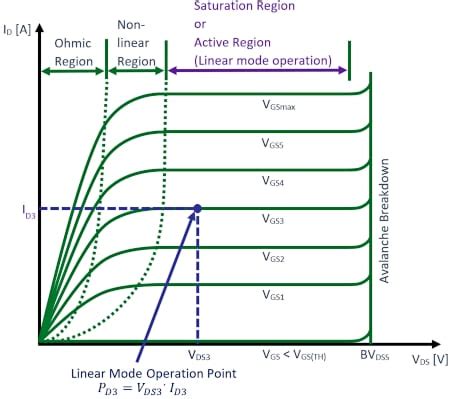 • Cut-off Region (Vgs < Vth): When the gate-source voltage (Vgs) is less than the threshold voltage (Vth), the MOSFET is in the cut-off region. No channel is formed, and no current flows between the source and drain. It’s like the switch is completely off.