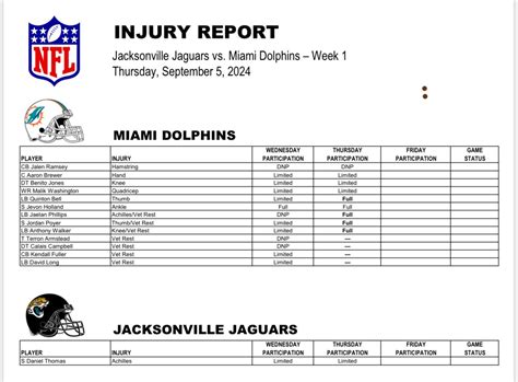• Who is injured: Specific player names.