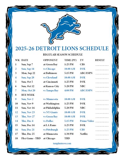 A printable schedule is more than just a list of dates and times; it’s a symbol of your dedication and passion for the Detroit Lions. It represents the anticipation, excitement, and shared experiences that define the football season. As you fill out your schedule, you’re not just planning your weekends; you’re joining a community of fans who share your love for the game. The roar of the crowd, the thrill of victory, and the camaraderie among fans make being a Lions supporter a unique and rewarding experience. So, grab your printable schedule , don your Honolulu blue and silver, and get ready to cheer on the Detroit Lions as they strive for greatness in the 2025-2026 season ! Go Lions!