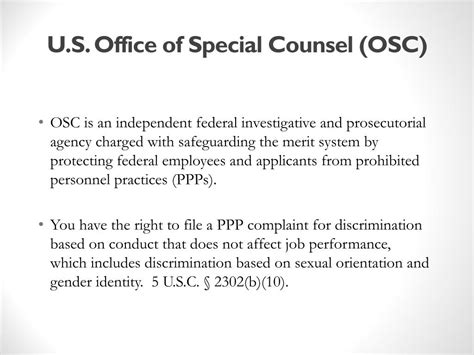 Another massive piece of the puzzle is the investigation of prohibited personnel practices (PPPs) . What are these, you ask? Well, a PPP is basically any personnel action that is illegal, unfair, or discriminatory. This covers a whole spectrum of bad behavior, guys. Think about things like: discrimination based on race, color, religion, sex, or national origin; reprisal for whistleblowing (which we just talked about, but it’s worth mentioning again because it’s so important!); nepotism (playing favorites with family members); obstruction of competition for a job; or taking actions based on arbitrary or capricious reasons rather than merit. The OSC has the authority to investigate these kinds of allegations. If they find that a PPP has occurred, they can recommend corrective or disciplinary actions to the agency head or, in some cases, to the Merit Systems Protection Board (MSPB). This function is essential for ensuring that federal employment is based on merit and fairness, not on personal connections or discriminatory motives. It helps maintain employee morale and ensures that the government can attract and retain the best talent, regardless of their background. It’s about creating a level playing field for everyone working within the federal system. This process often involves complex investigations, interviews, and evidence gathering, demonstrating the OSC’s commitment to thoroughly addressing these serious matters. The goal is to prevent unfair treatment and uphold the principles of equal employment opportunity and fair process for all federal employees. The OSC’s role here is preventative as well, by setting a standard and deterring managers from engaging in such prohibited practices in the first place.