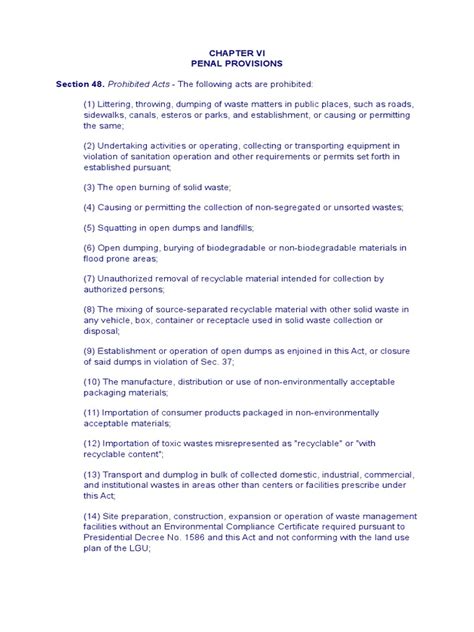 It’s important to note that these are just some of the specific violations and penalties outlined in RA 9003. The law also includes provisions for other offenses related to solid waste management, such as the illegal collection of recyclable materials and the obstruction of waste collection activities. So, it’s always best to err on the side of caution and make sure you’re following the rules!