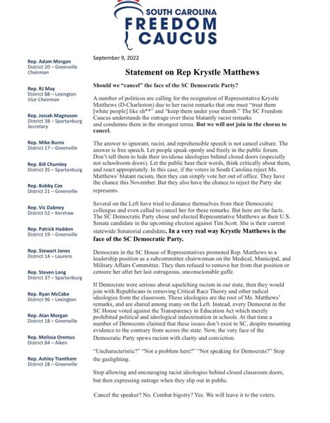 Hey everyone! Today, we’re diving deep into the South Carolina Freedom Caucus , a group that’s been making waves in the Palmetto State’s political scene. You’ve probably heard the name tossed around, but what exactly is this group, and who are the individuals behind it? Well, buckle up, because we’re going to break it all down for you. Understanding political caucuses is super important if you want to get a handle on how legislation actually gets made and who’s pushing for what. They’re basically groups of lawmakers who band together because they share similar ideologies, goals, or interests. Think of them as a team within the larger team of the legislature, focused on specific priorities. The Freedom Caucus, in general, often aligns with a more conservative or libertarian viewpoint, emphasizing individual liberty, limited government, and free markets. When we talk about the SC Freedom Caucus members , we’re looking at a specific contingent of South Carolina legislators who have aligned themselves under this banner. They’re not just random folks; these are elected officials representing you, your neighbors, and your communities across the state. Their actions and votes can significantly impact the laws that govern South Carolina, from how your taxes are spent to the regulations businesses have to follow. So, getting to know these members is key to understanding the political landscape of South Carolina. It’s about knowing your representatives and what they stand for.