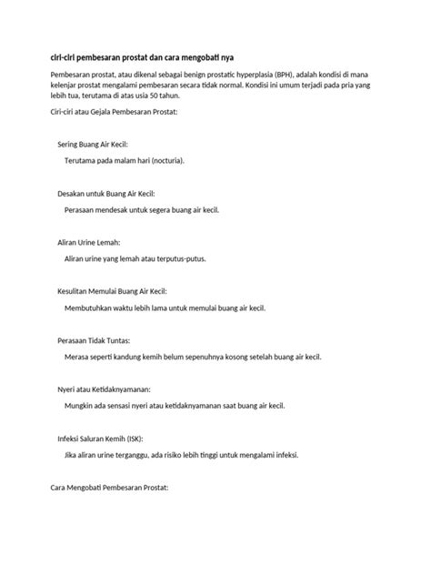 Periksakan diri ke dokter secara rutin adalah langkah penting untuk mendeteksi dini masalah prostat dan mencegah pembesaran prostat. Dokter dapat melakukan pemeriksaan fisik dan tes urine untuk mengevaluasi kesehatan prostat Anda. Jika Anda memiliki riwayat keluarga dengan masalah prostat atau mengalami gejala-gejala seperti sulit buang air kecil, sering buang air kecil di malam hari, atau aliran urine yang lemah, segera konsultasikan dengan dokter. Deteksi dini dan pengobatan yang tepat dapat mencegah komplikasi yang lebih serius.