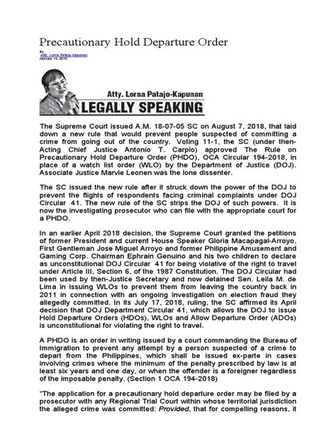 Alright, let’s get straight to it. A Precautionary Hold Departure Order , often abbreviated as a PHDO, is basically a legal instruction issued by a competent authority. Think of it like a stop sign put up by the court or a government agency. Its primary purpose is to prevent a specific individual from leaving a particular jurisdiction , whether that’s a city, a state, or even a country. It’s called ‘precautionary’ because it’s often issued to ensure someone doesn’t abscond or disappear before a legal process is completed. This could be anything from a civil lawsuit where a debt needs to be settled, to a criminal investigation where the person’s testimony or presence is crucial. The ‘departure order’ part is pretty self-explanatory – it orders you not to depart. The specific number, AM No. 18-07-05 SC , is just an internal reference number, like a case file number, used by the issuing authority to track this particular order. It helps them keep things organized and ensures that if questions arise, they can easily pull up the relevant documentation. So, in simple terms, if you get hit with this order, you’re basically being told, “Hold up! You can’t leave right now because there’s something important you need to deal with here first.”