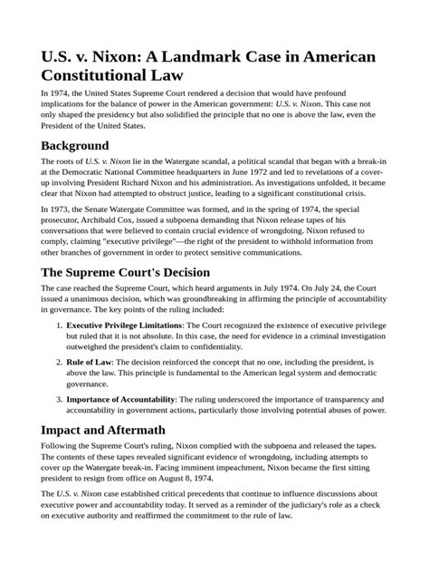 In essence, United States v. Nixon is a landmark case that powerfully illustrates the enduring strength of American democratic institutions. It demonstrates that even in the face of immense political pressure, the rule of law and the Constitution can prevail. It’s a case that every student of American civics should understand because it directly addresses the constitutional issue at the heart of United States v. Nixon : how to balance the legitimate needs of presidential confidentiality with the non-negotiable requirement of accountability and justice under the law. It’s a critical lesson in how our government is designed to keep power in check and ensure that the pursuit of truth and justice remains a central tenet of our democracy.